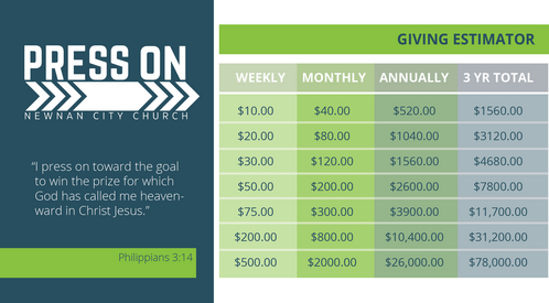 If Newnan City Church is your home, I invite you to prayerfully consider partnering with us on March 23, 2025, as we commit to a three-year journey to fully pay for this building. I am deeply grateful to be your pastor and thankful for your partnership. This is an exciting season as we PRESS ON toward where God is leading us—creating space for future generations to be transformed by the power of Jesus Christ.